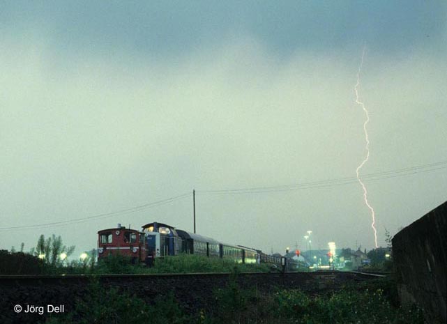 Das war eine feuchte Angelegenheit! Einen ganzen Film habe ich verknipsen müssen, um wenigstens einen Blitz einigermaßen vernünftig einfangen zu können. Das ganze spielte sich in Gründau-Lieblos ab, wo die Panzerverladung gerade abgeschlossen war und 333 181 und 212 119 mit ihrer illustren Garnitur aus DB-Umbau- und SBB-Leihwagen auf Abfahrt warten. Die Gewitterwolken hatten sich indes über mir entleert (14.9.1984).